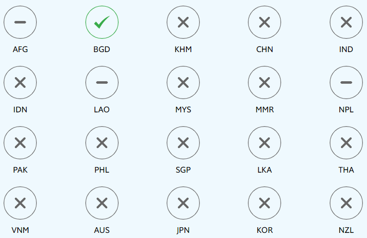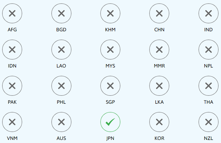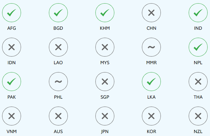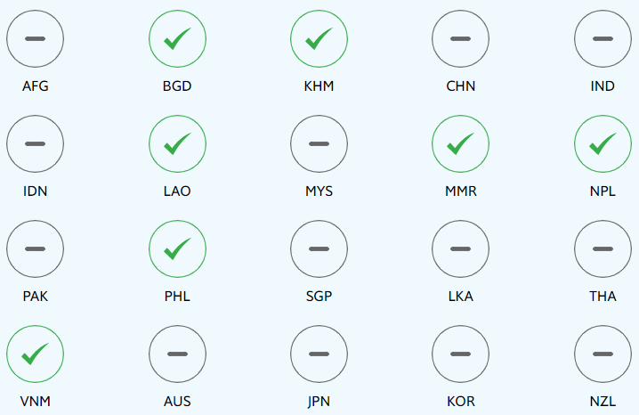 This project focuses on 20 countries in Asia-Pacific, home to over 50% of the world population. These include all countries with available data and a population of at least five million in the Asia-Pacific region, with the exception of North Korea (PRK) and Papua New Guinea (PNG). Namely: Afghanistan (AFG), Australia (AUS), Bangladesh (BGD), Cambodia (KHM), China (CHN), India (IND), Indonesia (IDN), Japan (JPN), Korea (KOR), Laos (LAO), Malaysia (MYS), Myanmar (MMR), Nepal (NPL), New Zealand (NZL), Pakistan (PAK), the Philippines (PHL), Singapore (SGP), Sri Lanka (LKA), Thailand (THA) and Vietnam (VNM). Since the establishment of the SDGs in 2015, these countries have made uneven progress across the SDGs.